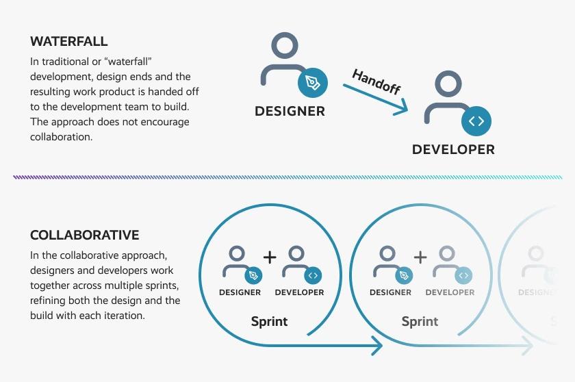 Diagram comparing waterfall and collaborative development methodologies. Top section shows waterfall approach with designer handing off work to developer in a linear flow. Bottom section illustrates collaborative approach with designers and developers working together in iterative sprints, represented by overlapping circles containing paired designer and developer icons.​​​​‌‍​‍​‍‌‍‌​‍‌‍‍‌‌‍‌‌‍‍‌‌‍‍​‍​‍​‍‍​‍​‍‌​‌‍​‌‌‍‍‌‍‍‌‌‌​‌‍‌​‍‍‌‍‍‌‌‍​‍​‍​‍​​‍​‍‌‍‍​‌​‍‌‍‌‌‌‍‌‍​‍​‍​‍‍​‍​‍‌‍‍​‌‌​‌‌​‌​​‌​​‍‍​‍​‍‌‌‍‌​‌‍‍​‌‍‍‌‌‍‌‍‌‌​​‍‌‌‌‌‍‌‌‌‍​‍‌​‌‍‍‌‌‌​‌‍‌‌​‍‍‌​‌‍​‌‌‍‍‌‍‍‌‌‌​‌‍‌​‍‍‌​‌‌​‌‌‌‌‍‌​‌‍‍‌‌‍​‍‌‍‍‌‌‍‍‌‌​‌‍‌‌‌‍‍‌‌​​‍‌‍‌‌‌‍‌​‌‍‍‌‌‌​​‍‌‍‌‌‍‌‍‌​‌‍‌‌​‌‌​​‌​‍‌‍‌‌‌​‌‍‌‌‌‍‍‌‌​‌‍​‌‌‌​‌‍‍‌‌‍‌‍‍​‍‌‍‍‌‌‍‌​​‌‌‍‍‌‌‍‌‌‍​‌‌‍‌‌‍‌‌​‍‌​​‌‌‍‌​​​​‌​​​‌‍​‍​‌‍​‌‌​​‍​‌‍​​​‌‌​‍​​‌‌‌‍​‌‍​‍‌‍‌‌​‍​​​​​‌‌‍​‍​​​‌‍​​​‌​​‌​‍​‌‍‌‍​​‍​​‍‌‍​‍​​‌​‌‌‌‍‌​‌‍‌‍​​‌‌‍​‍​​‍‌‍​‌​​‌​​​‍‌​‍​​‌​​​​‌‍​​‌‌​‌‌​‍​​‍‌‌‌‌‍‌‌‌‍​‍‌​​​‍‌‌​‌‍‌‌​​‌‍‌‌​‌‌​‌‍​‌‌‍‍‌‍‍‌‌‌​‌‍‌​‍‍‌‍‍‌‌‍‌‌‍​‌‌‍‌‌‍‌‌‌​​‌‌​‌​‌‍‌‌‌‌​​‍‌​​‌‍​‌‌‌​‌‍‍​​‌‌‍​‌‌‍​‌‌​‌‌‌​‌‍‌‌‌‍​‌‌​​‌‍​‍‌‍​‌‌​‌‍‌‌‌‌‌‌‌​‍‌‍​​‌‌‍‍​‌‌​‌‌​‌​​‌​​‍‌‌​​‌​​‌​‍‌‌​​‍‌​‌‍​‍‌‌​​‍‌​‌‍‌‌‍‌​‌‍‍​‌‍‍‌‌‍‌‍‌‌​​‍‌‌‌‌‍‌‌‌‍​‍‌​‌‍‍‌‌‌​‌‍‌‌​‍‍‌​‌‍​‌‌‍‍‌‍‍‌‌‌​‌‍‌​‍‍‌​‌‌​‌‌‌‌‍‌​‌‍‍‌‌‍​‍‌‍‌‍‍‌‌‍‌​​‌‌‍‍‌‌‍‌‌‍​‌‌‍‌‌‍‌‌​‍‌​​‌‌‍‌​​​​‌​​​‌‍​‍​‌‍​‌‌​​‍​‌‍​​​‌‌​‍​​‌‌‌‍​‌‍​‍‌‍‌‌​‍​​​​​‌‌‍​‍​​​‌‍​​​‌​​‌​‍​‌‍‌‍​​‍​​‍‌‍​‍​​‌​‌‌‌‍‌​‌‍‌‍​​‌‌‍​‍​​‍‌‍​‌​​‌​​​‍‌​‍​​‌​​​​‌‍​​‌‌​‌‌​‍​​‍‌‌‌‌‍‌‌‌‍​‍‌​​​‍‌‍‌‌​‌‍‌‌​​‌‍‌‌​‌‌​‌‍​‌‌‍‍‌‍‍‌‌‌​‌‍‌​‍‍‌‍‍‌‌‍‌‌‍​‌‌‍‌‌‍‌‌‌​​‌‌​‌​‌‍‌‌‌‌​​‍‌‍‌​​‌‍​‌‌‌​‌‍‍​​‌‌‍​‌‌‍​‌‌​‌‌‌​‌‍‌‌‌‍​‌‌​​‍‌‍‌​​‌‍‌‌‌​‍‌​‌​​‌‍‌‌‌‍​‌‌​‌‍‍‌‌‌‍‌‍‌‌​‌‌​​‌‌‌‌‍​‍‌‍​‌‍‍‌‌​‌‍‍​‌‍‌‌‌‍‌​​‍​‍‌‌
