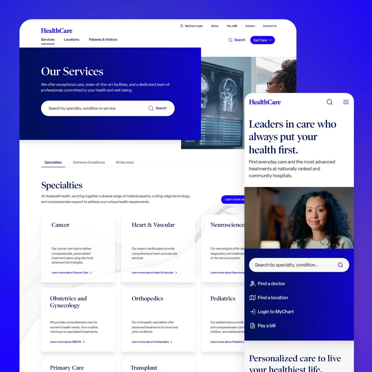The new centralized platform featured consistent and modernized design and messaging across every entity. The work included a comprehensive design system, rebuilt site architecture, updated content, and integrated tools and analytics. We also retired more than 1,000 outdated or redundant pages so people could find the right care faster, with less friction.